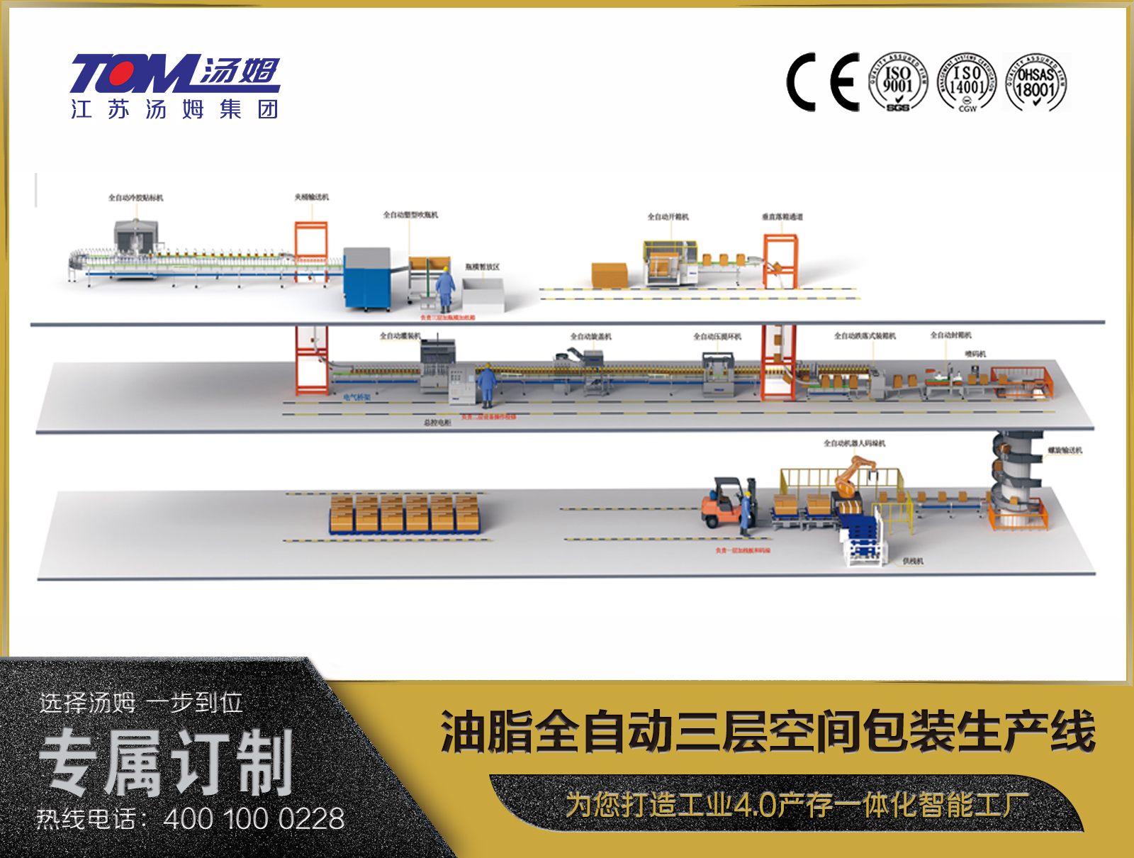 江蘇湯姆森智能裝備有限公司 是江蘇湯姆集團(tuán)旗下全資子公司,坐落于常州市金壇區(qū)儒林鎮(zhèn)99號(hào),是專業(yè)生產(chǎn)農(nóng)化、日化、潤滑油、涂料、化工、調(diào)味品、鋰電新材料智能包裝裝備的廠家,工廠占地150畝,建筑面積120558㎡,擁有員工800多人,博士生2名,碩士研究生30名,本科358名,目前已取得ISO9001質(zhì)量體系認(rèn)證、ISO14001環(huán)境管理體系認(rèn)證、OHSAS18001職業(yè)健康安全體系認(rèn)證、CE認(rèn)證。26年來,經(jīng)過湯姆人的艱苦奮斗,湯姆集團(tuán)不斷創(chuàng)新發(fā)展、與時(shí)俱進(jìn),為4000多家企業(yè)提供了一代又一代先進(jìn)的智能包裝設(shè)備,為客戶打造工業(yè)4.0智能化工廠;為客戶提供自動(dòng)化立體倉庫;為客戶創(chuàng)建智慧工廠生產(chǎn)數(shù)據(jù)采集執(zhí)行系統(tǒng)(MES)。 了解更多>>