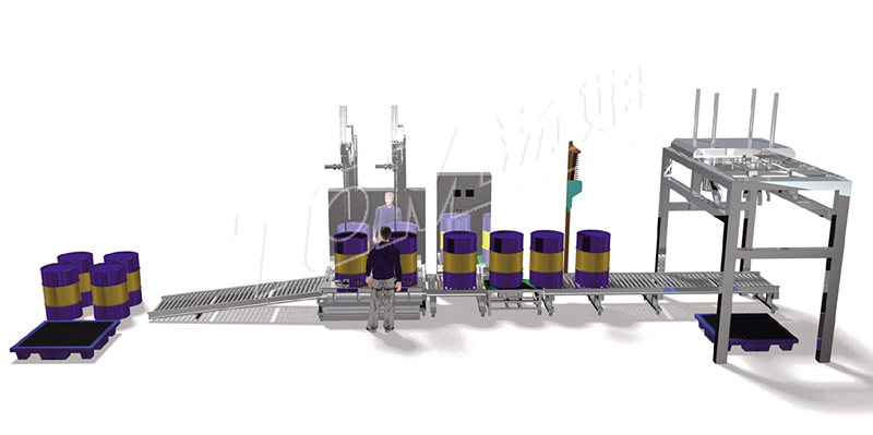 ·200KG塑料桶灌裝線:根據用戶200KG桶的包裝而設計,人工將空桶開好蓋子擺放在空桶輸送線上,自動將桶輸送到雙頭灌裝位置,自動對準桶口、自動灌裝、灌裝結束通過輸送滾筒輸送到二次稱重檢測位置,重量有偏差的停機報警,人工處理,人工旋蓋,選好蓋輸送到后端碼托盤位置,人工將托盤擺放在指定位置,每個托盤上碼4只桶,碼好后人工轉移儲存。整條線采用集中控制柜集中控制各個位置的機器及連鎖動作。