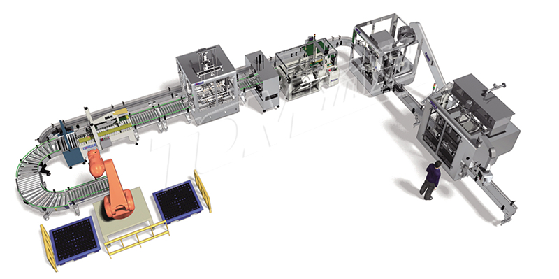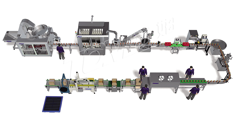 ·100-1000ml的圓瓶包裝線:本流水線由自動理瓶、活塞式灌裝、自動上蓋機、旋蓋機、單瓶檢重、緩沖轉盤、自動貼標、人工套膜、電加熱收縮、人工裝箱、自動箱檢重(不合格的停機報警)、自動封箱打包、人工碼垛組成。